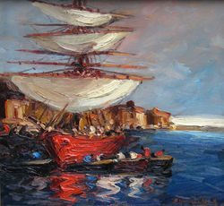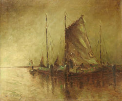 En 1916 realizó su primera exposición en Buenos Aires, donde presentó los temas que lo acompañaron a lo largo de su carrera: marinas, los muelles de Londres, los puertos holandeses, procesiones y crisantemos, los cuales realizaba con una paleta atemperada, rica en matices de gris. El clima y el color de sus obras de este período, nos traen reminiscencias de la pintura de la Escuela de La Haya.
